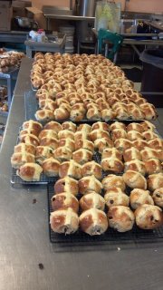 This is part of the 40 dozen Hot Cross Buns our church baked as a fund raiser. We used Hammelman's Breasd recipe scaled to a 4 dozen batch size.   There were 7 of us baking so it didn't get so hectic when we started weighing and forming. The really cool thing about this project was that all the dough was mixed by a 15 year old in our parish that loves to bake. He arranged with his teacher to be away from school and received credit in his food class for helping us.  He had  a ball. It is great to see a young person be so enthusiastic about baking.