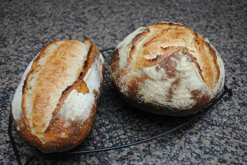 two brothers, side by side - one recipe of the Vermont Sourdough with Whole Wheat (Hamelman), divided roughly as 60% (round loaf) and 40% (oval)