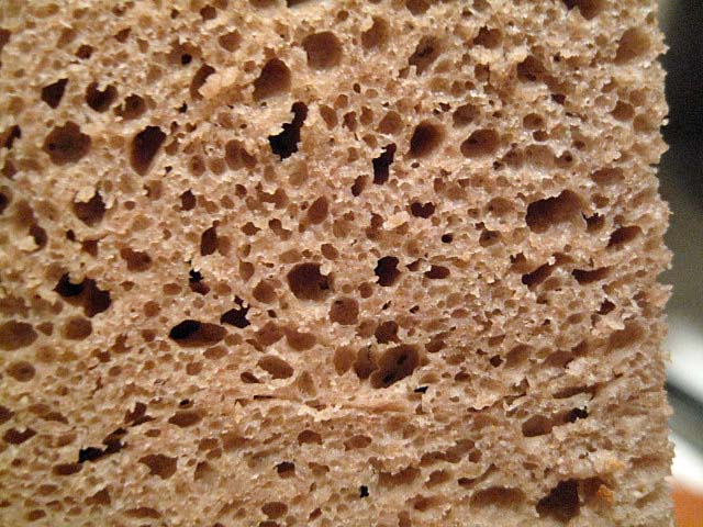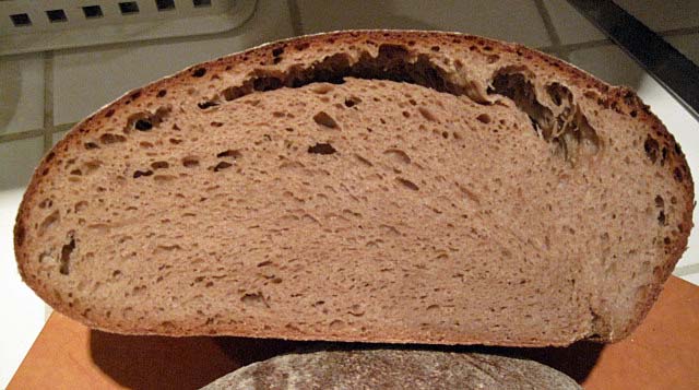 The loaf had good oven spring. I cooled it for about 2 1/2 hours before slicing. It was still a bit warm in the middle when I sliced it, but I wanted to have a slice (or 3) with dinner. The crumb structure was pretty similar to Phil's, except for the tunneling under the crust, always a risk when you bake a loaf without scoring.