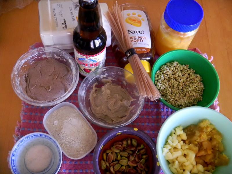 Because the mix – ins were so wet (compared to sweetbird’s), I added 30 g of BW and 30 g of BF to them and let it autolyse while the dough was doing the same thing, added chopped pistachio nuts and chopped cooked buckwheat soba noodles, added fermented apple pieces saved when refreshing the YW that were previously frozen, re-hydrated the dried apples in apple juice.