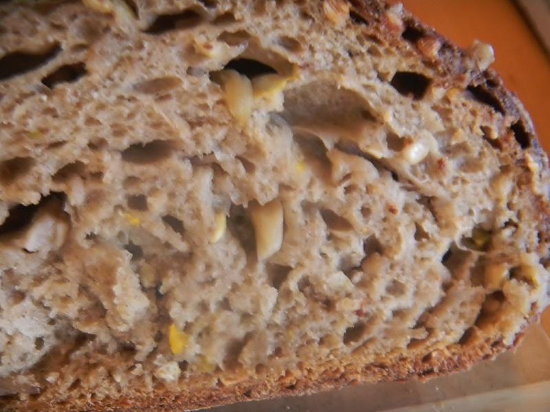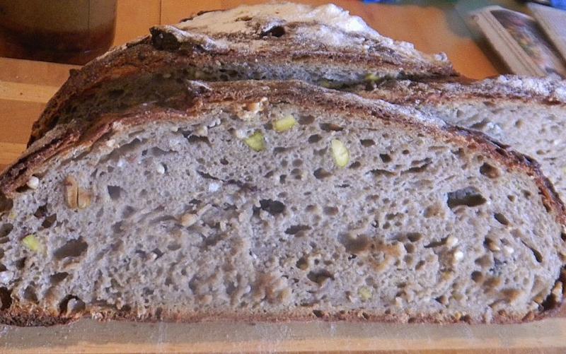 fruit and nuts the crumb wasn't too bad.  This bread tastes great.  I usually have 1 piece of bread at dinner but I had 2 tonight and these were really big - one was toasted with butter and one was plain.  For a man eating, evil boule  -  it went down way too easy, with barely a whimper - Sad really :-)