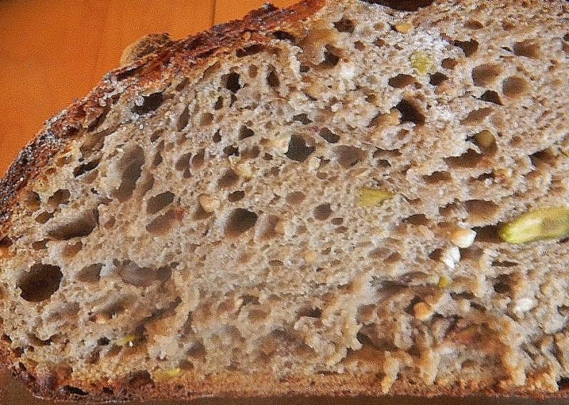My apprentice also cut the salt to 10 g from 11 since the pistachios seemed salty to her when tasted for poison and she was a little bloaty this morning, added 15 g home made white diastatic malt to the vital wheat gluten, and finally, subbed bread flour for the AP which birdsong recommended doing after her bake.