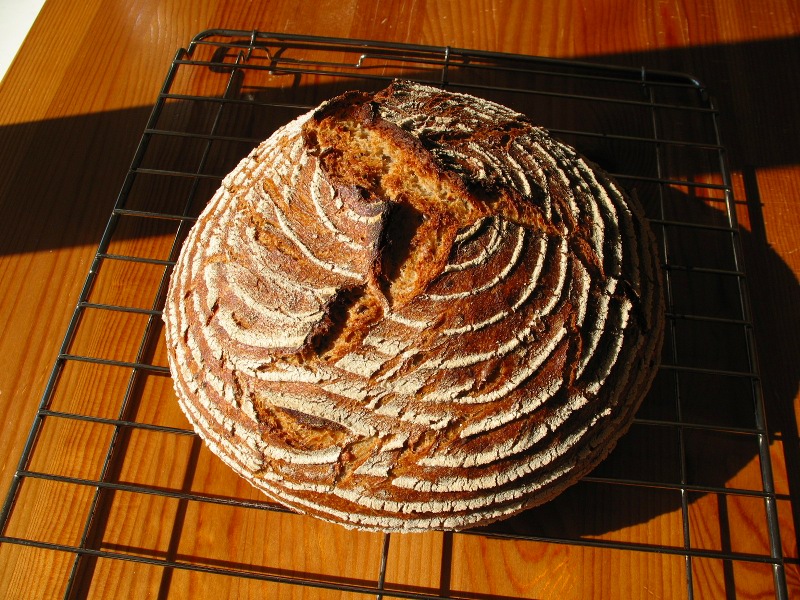 Although I try to spend as much time out in the sun as I possibly can, the cold, frostbitten weekend mornings are still excellent for dough handling and bread baking. I've baked two multigrain rye loaves this weekend; the first, the boule below, was an improvised 50% sourdough rye, with some flaxseeds, sunflower seeds and rolled oats added to it. The hydration was a bit over 90%, so this loaf has kept fresh for several days, just improving in flavour.