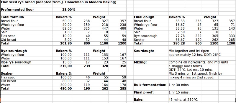 Edit: Below is a copy of the formula for the flax seed rye bread above. Hamelman's original recipe in Modern Baking can be found here.