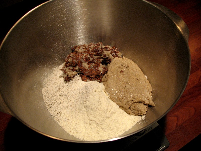 The second loaf was one of my old favourites: Hamelman's flaxseed rye from the Modern Baking website. I baked this regularly before, and I can't believe it's been over a year since I last tasted a sample of this one (shame on me). High time to get everything together in the mixing bowl (clockwise from top: old bread + flaxseed soaker, rye sourdough, bread flour and whole rye flour)!