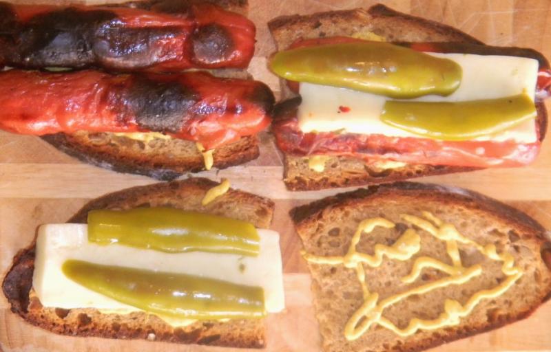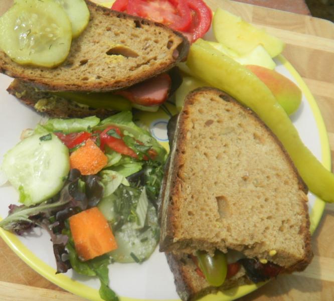 Nice lunch of grilled turkey franks on super-grain challah with cheese, pickled peppers and mustard, pickles, tomatoes, apples and a home grown salad.