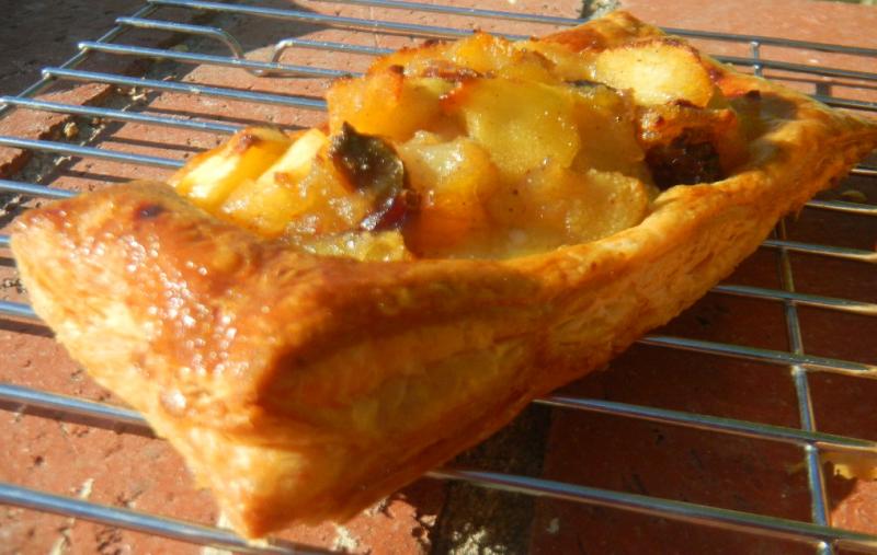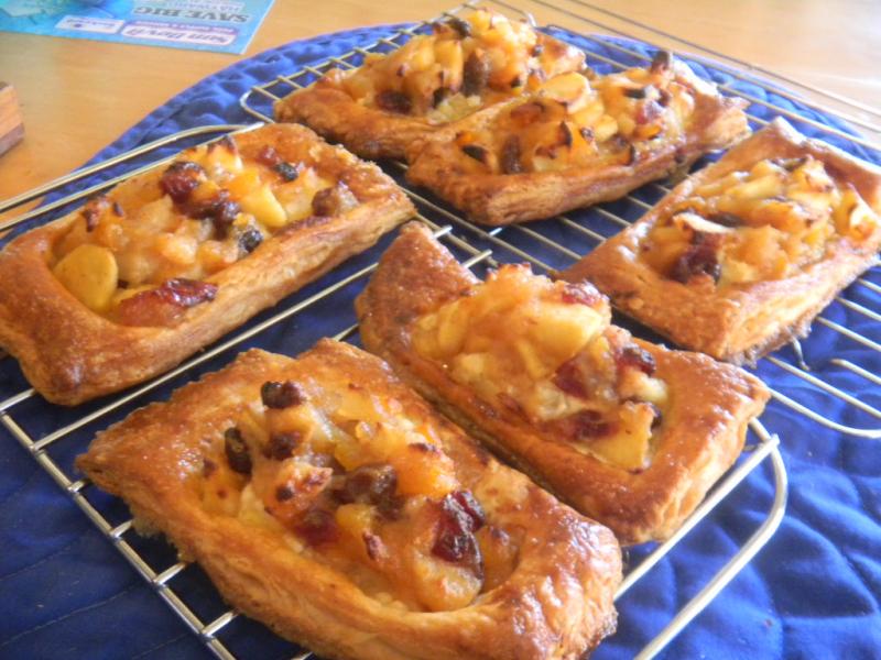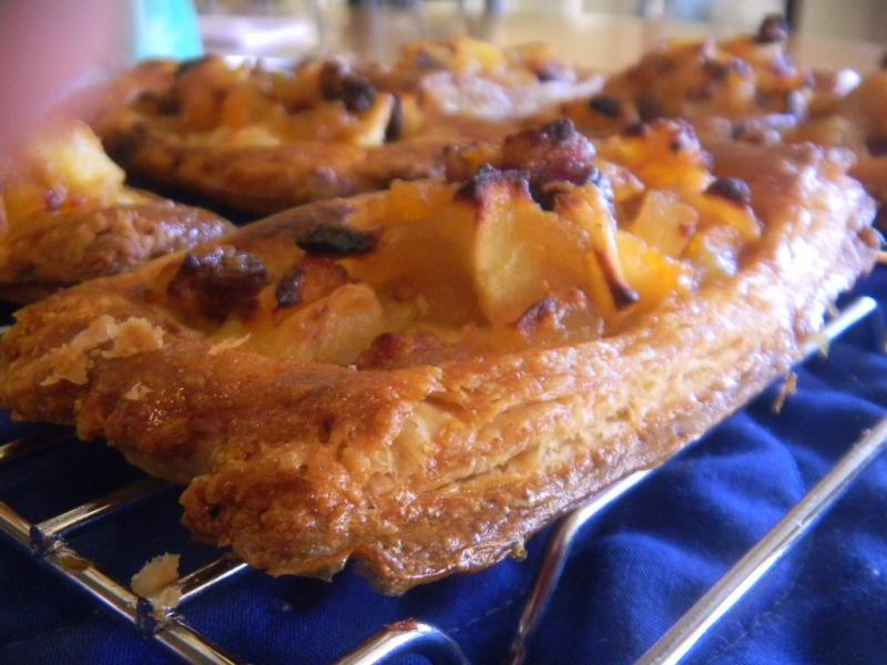 The other half of the puff paste we made the other day was used up on these tasty apple, pear and cream cheese sleds. This time I watched them to make sure these didn't over caramelize like the last variety. I mixed in some apple jam in the cream cheese that is on the bottom and hidden. Also, we reconstituted dried apricots, raisins and cranberries in some bourbon and also added fresh minced ginger to the chopped apples and pears that were sauted with some brown sugar and mixed spice. The middle of the sled was docked to keep it from puffing and make a well / seat for the riders on the sled :-)