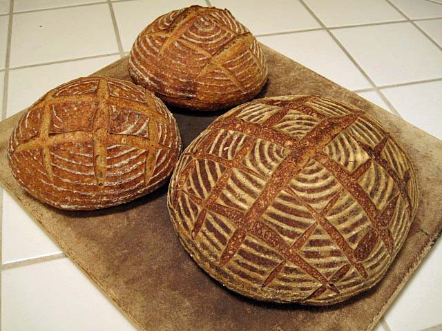 *Note: I baked the two smaller boules first – 15 minutes at 460ºF with steam, then 15 minutes at 435ºF convection bake. I then baked the 1 kg boule after reheating the oven for 25 minutes – 15 minutes at 450ºF, then another 25 minutes at 430ºF.