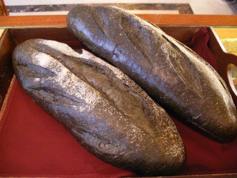 I'm currently in Rome checking out bakeries. I have found a very interesting new bread being made here which is called carbon bread. They do two versions, one a multi grain version and the other a glossy beautiful shiny black bread based on an olive oil bread formula. It looks like basalt.