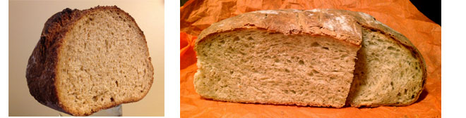 The Floriole miche (left, below) didn't fit my impression of a miche. I thought miche's were, above all, low and wide -- big loaves. Floriole's isn't. It's less than a pound, I'd guess, a funny little shape and not very 'more-ish' in flavor, for us at least. Has an unmistakable other grain note, maybe spelt. Disappointing. On the other hand, Hendrickx famous monster loaf (right, below) was a kick, and truly a festive loaf (as opposed to Floriole's serious batard). An entire (4 kg?) loaf sells for $37, but they sell halves and quarters. We bought a half. They wrap in orange paper. It's light, indulgent and thoroughly enjoyable. Surprised to see some streaks of unincorporated flour - from shaping on bench probably. Hamelman would ding 'em for that. I won't. Highly recommended.