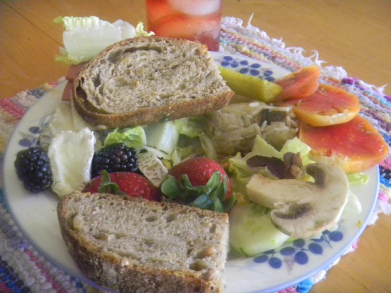 The crust browned very nice and dark, the way we like it, the seeds and sprouts were popping out here and  there.  Best of all the crust was very tasty. The crumb was fairly open with all the whole grains, seeds, and sprouts but the taste and texture were just great.  We really like how this bread tastes.  The SD tang was deep and complex so the 3 day process worked.  Can’t wait to taste it tomorrow.  Formula and methods follow the lunch shot.