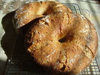 I was immediately intrigued by the wonderful photo on the front page - great shaping (I especially like the giant doughnut/bagel), and a great blend of flavours in the baked loaf too, I'm sure. Wonderful baking.