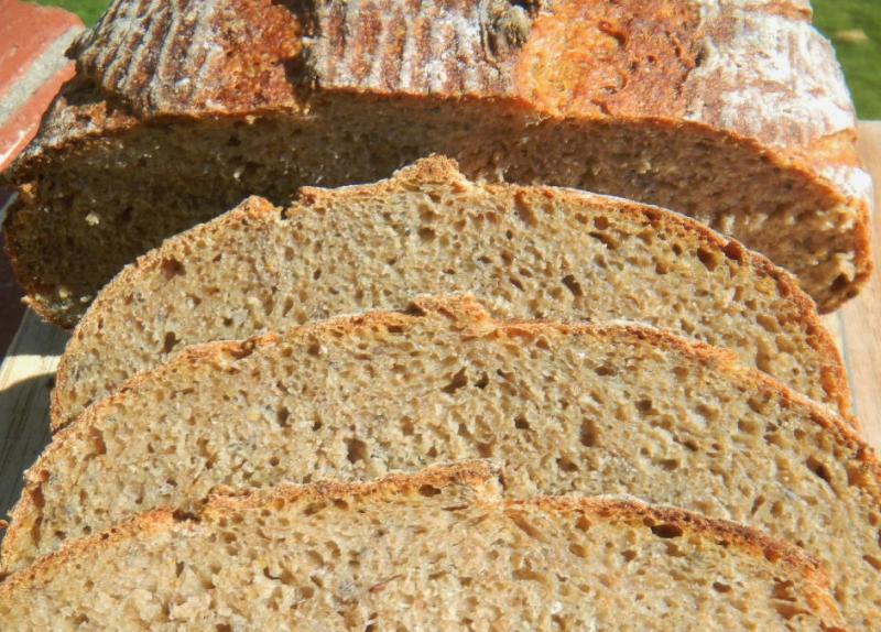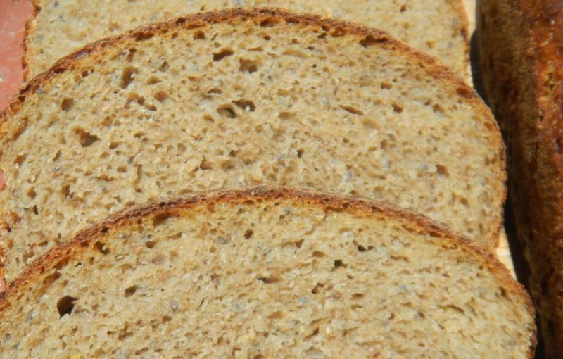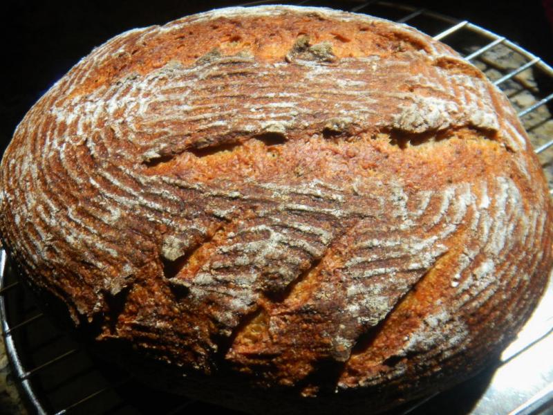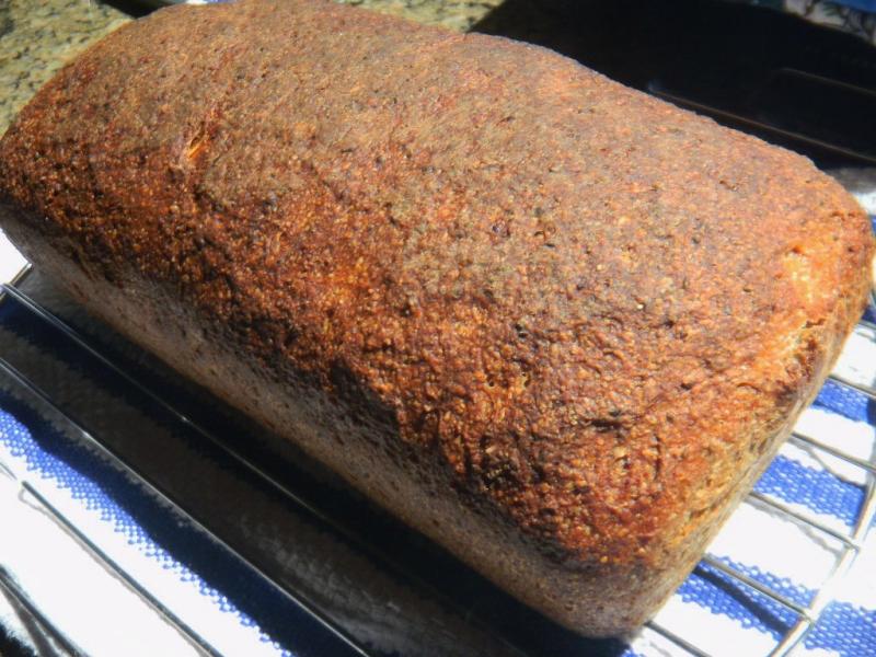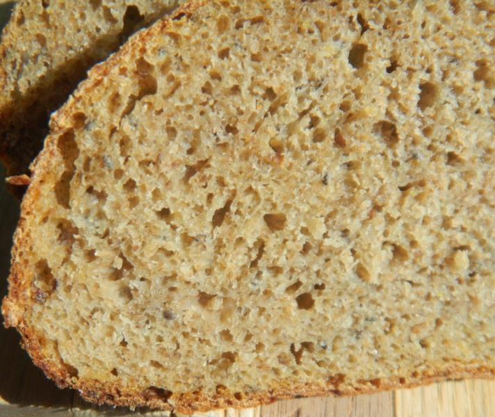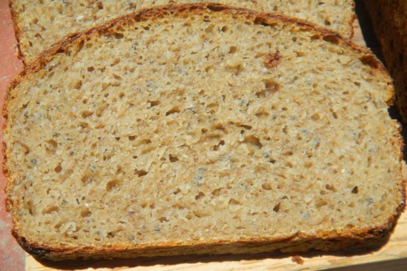 Even though the loaf was not slashed, since we managed forget to do so, I though for sure it would split somewhere but it only cracked down one side. There wasn’t much spring - about an inch. It browned up nicely though. We love the color that durum brings to bread inside and out and about 50% of this bread was durum with the other 50% whole grains of various varieties with wheat germ and the flax ground. The whole grains overpowered the yellow color of the durum with barn on the inside though. This bread is much more about being a hearty multi-grain variety.