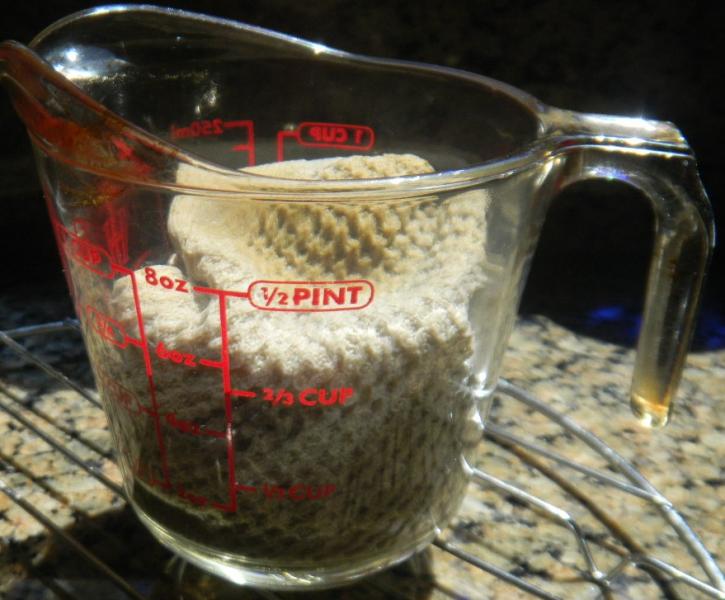 After an hour and half the loaf had doubled, passed the poke test and ready to bake . Sylvia’s steaming method was used with a wash rag heated in a half full Pyrex 1 cup measure in the microwave and the placed in the back of a 500 F preheated Cuisinart Mini Oven. No stone was used. The loaf was not slashed but was steamed for 12 minutes and then the steam removed and the temperature turned down to 425 F convection this time.