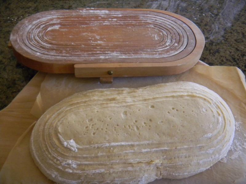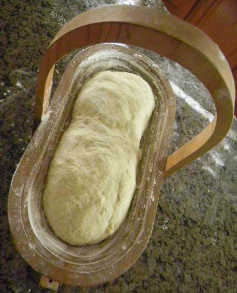 The dough was removed from the fridge in the morning and allowed to come to room temperature for 1 ½ hours. It was then pre-shaped into a batard and allowed to rest for 10 minutes before final shaping. The batard was placed into a rice floured wooden contraption and allowed to double in a plastic trash sack until it passed the poke test – about 3 hours – about an hour longer than normal due to the levain not being as active as normal.