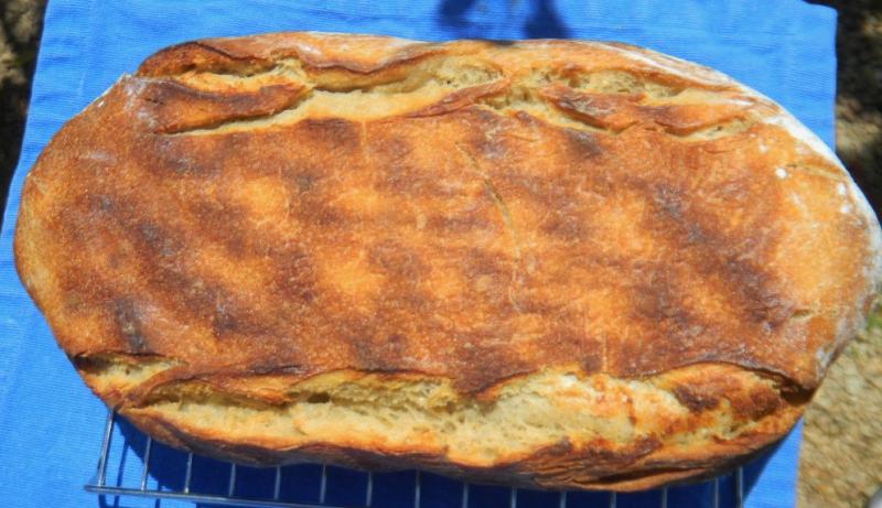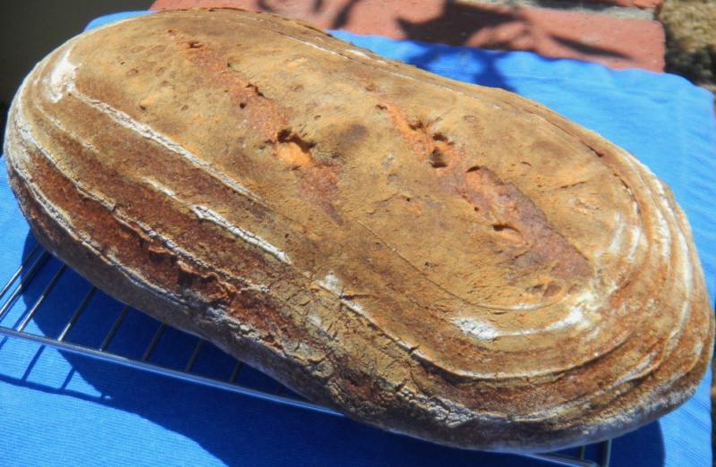 Preheating and Sylvia’s steaming method went well but the dough stuck to the wooden articulating form and deflated as it released but it sprang back very nicely in the oven like a ciabatta. I’m guessing poor forming and slashing caused the batard to split along the length of both of the long sides of the bottom - so the bloom at the slashes was pretty weak.