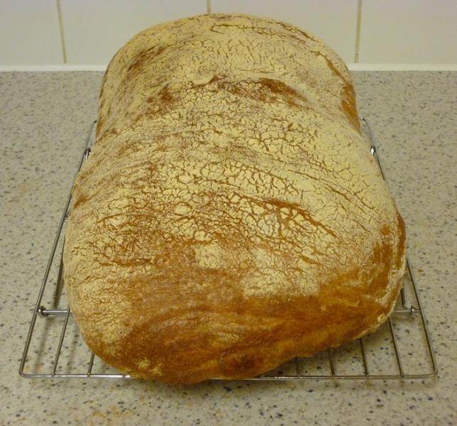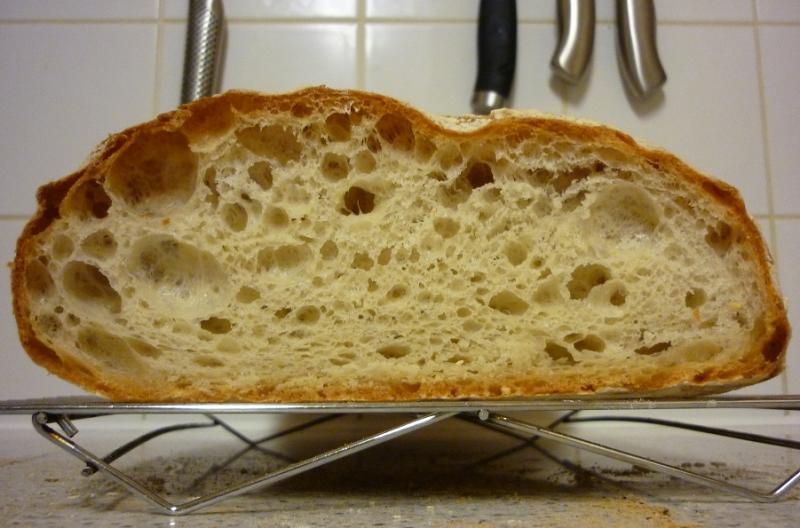 I made an enormous ciabatta weighing nearly 1 kilo. I used an 18hr-fermented biga starter and a combination of medium and weak flours. This thing was massive!