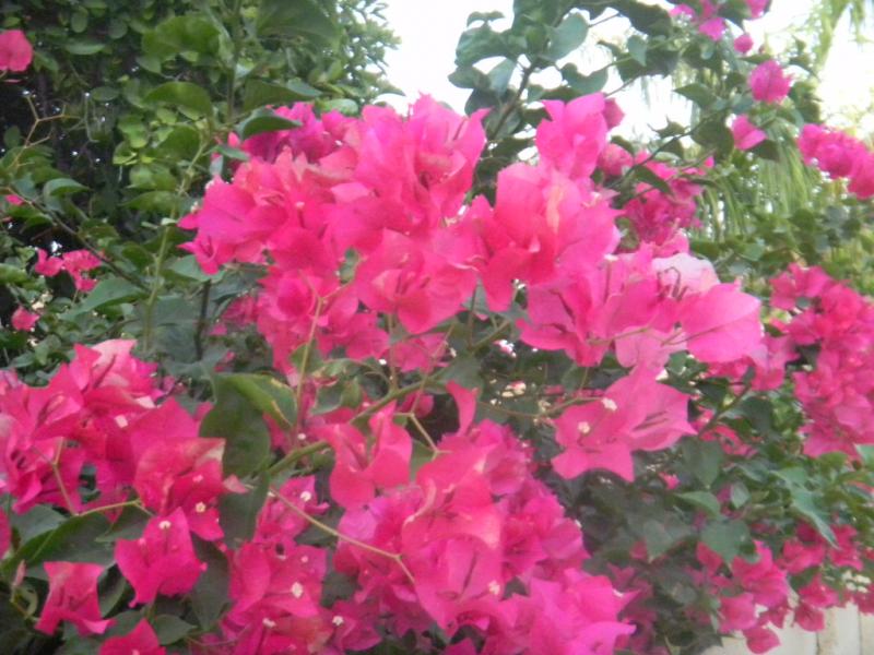 Those are Bougainvilla's. We used to have a pile of them, probably 20 in all kinds of different colors. Very pretty but I ended up hating them. They have killer needle like spikes 1-2 " long, all over the stems and make rose bushes and cactus feel like baby pricklies. They grow like weeds and have to be trimmed all the time which is when they hurt you. The flowers were always in the pool, also pretty but a pretty mess to clean up, we thought there was wedding in our back yard every day! Finally ripped them all out. The picture is from one that I trimmed that morning which was growing over the wall from the neighbor's yard. I'd sue him if he wasn't a lawyer!