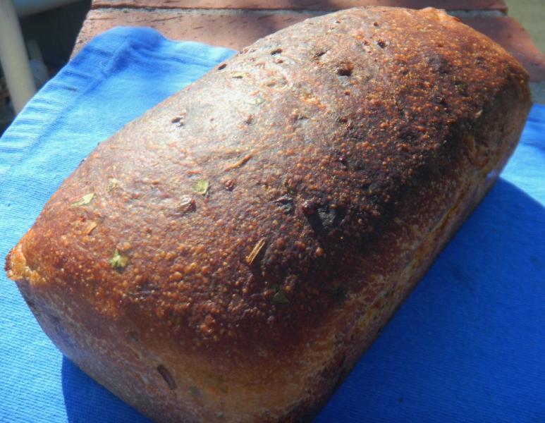 The un-slashed loaf of bread, using the same dough, was baked in the mini oven at450 Fafter preheating with 'Sylvia’s Steam' at 500 F.  It was steamed for 12 minutes then the steam was removed, the loaf rotated 180 degrees and the mini oven was turned down to 425 F convection this time.  The loaf was rotated every 5 minutes until it was done and205 Fon the inside – about another 20 minutes – 32 minutes baking time total.  It was left in the oven with the door ajar and heat off for 10 minutes to further crisp the skin.