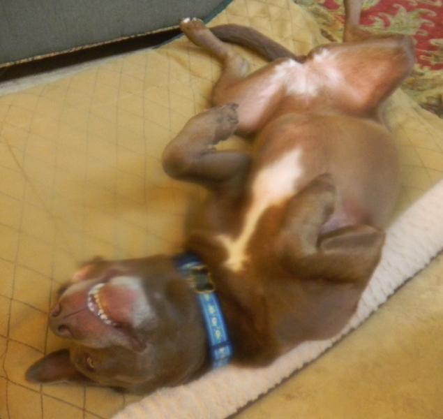 My new best dog friend named Truffles, was totally washed out from our 4 mile walk, making dinner and vino.    But even asleeping with 4 paws in the air, her evil eye was on anyone who tried to pinch a morsel from our plates.  She is the sweetest pit bull/weimaraner mixed rescue pooch one could ever want.  Check out those yellow eyes!