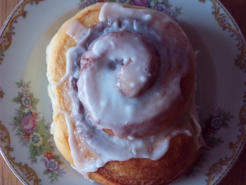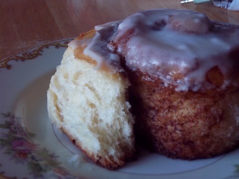 The next morning I had to have one for breakfast. These are seriously, dangerously good! And the thing is, every time I make these, I never make them the same way and each time they never disappoint. In my haste the night before to make a glaze you can tell I was unconcerned with the occasional lumps of powdered sugar. I just couldn’t wait to take a bite!