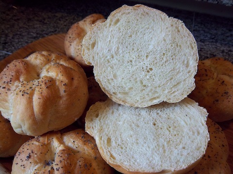 Every other weekend we have friends come over to our house for a little socialization and we take turns providing food. Last week was our turn and I wanted to get away from ordering take-out like we have been doing lately. I wanted to put some effort into the meal instead of being lazy so we decided on burgers and BBQ chicken. I took this opportunity to make the rolls for burgers. This is the second time making the Kaiser rolls from Peter Reinhart’s The Bread Baker’s Apprentice and I was hoping these would turn out better than my first attempt. Turns out I was right!