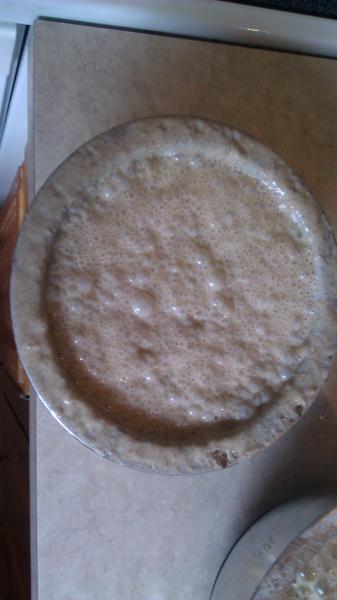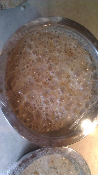 Tassajara Bread Book" - by Edward Brown. All great authors, all great chefs, all great bakers. In regards to equipment I do have a nice bread mixer, I have the right pans, a clean work surface and I'm starting with a clean kitchen. Our oven is clean and functional and I have cooling racks to get my loaves cooled down quickly. Lastly I do have a decent baking stone, but don't get hung up on that. Any brick wrapped in foil will do. A decent internal thermometer is also nice to have. You may remember, the last time I tried this, I ended up in the hospital for a week. Join me in hoping for a better outcome would ya?! One poster said that I may be allergic to wheat. That is something my wife would love to convince me of. No such luck on a wheat allergy, just a bad season for headaches. :-) Meanwhile I'm onto my second feeding so lets see how we look.