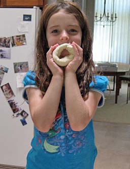 Three year old, Sasha, really liked rolling out the ropes for the bagels. Your challah mistress should have that step mastered. It's time she diversified! :-)
