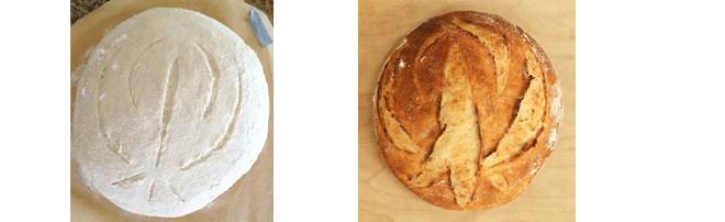 8. Bake on preheated stone in 500˚F oven turned down to 450˚F at start, for 20' with steam. Remove steam apparatus, reduce oven temperature to 440˚F, and bake for an additional 20' with convection.