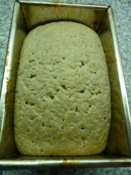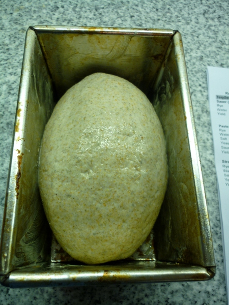for me. As far as your loaf being dense and I haven't baked many 100% ryes but the one's we have done were sprinkled on top with a light dusting of rye flour and then waiting for the top to crack before baking to make sure that the dough is fully proofed. This was a tip and recommendation by Phil for novices to know how well proofed the loaf is since ryes are so difficult to tell and poke testing doesn't work well at all. I don't know if your loaf was under proofed or not, it seems like a pretty good crumb for a dough that looks so stiff - with no bulk ferment too. It doesn't have the cracks on top, either before or after baking, that I see on so many other 100% ryes. Maybe this is isn't a good indicator except for rye novices like me. The dusting does change the look of the bread and yours is quite handsome without it I must say.