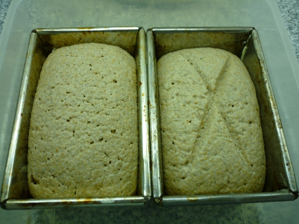 Here just before they go in the oven; the bulk proofed loaf has the X: