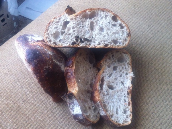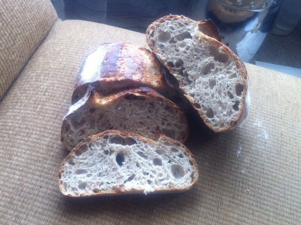 has to be some fine eating bread. Looks fantastic inside and out! wiuth a 90 F kitchen adn a 3 hour bulk ferment I'm not sure we could have contained it without slapping it around at little, stretcheing it and folding it up on itslef before cooling it :-)