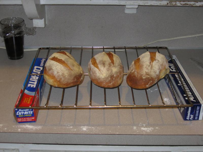 Very pretty! I finally took a rack out of my oven and cleaned it up so I could use it as a cooling rack. Evident on the right-hand loaf is where I had to pull it off another one because I got way more oven spring than I've ever gotten with a loaf before. Note to self: Heated cookie sheet is good for oven spring.