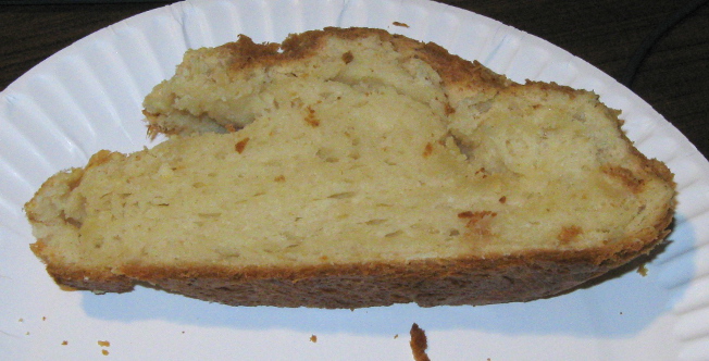This loaf was really dense. It actually came out more like a biscuit than bread, but it was amazingly tasty - kinda like bread made from a biscuit, because it had sort of a cross between the two flavors. I just threw out about an inch wide portion of the second loaf since it's been sitting around for a couple of days, but I'm sure it could have easily been made edible again if I really wanted.