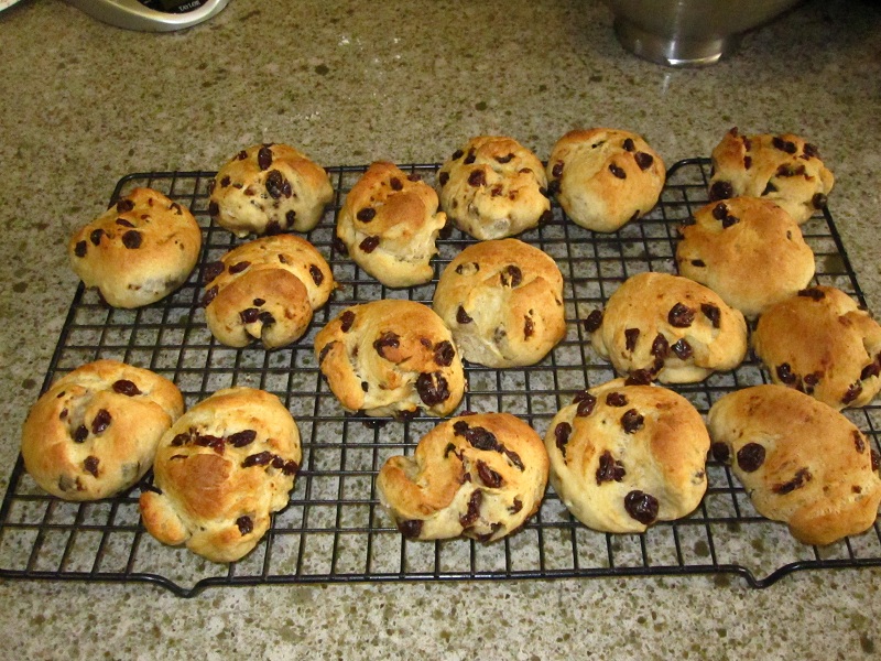 I found that the dough seemed too dry to come together well so I added another slosh of buttermilk, maybe a tablespoon or two. I weighed two cups of loose raisins and measured 270g; this seems a bit excessive and 200g might be more reasonable. I popped the rolls in the oven at 350F with steam and set the timer for 20 minutes; after checking at 20 minutes I gave them another 2 minutes or so to brown up a bit.