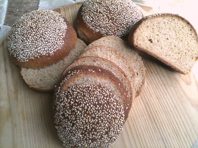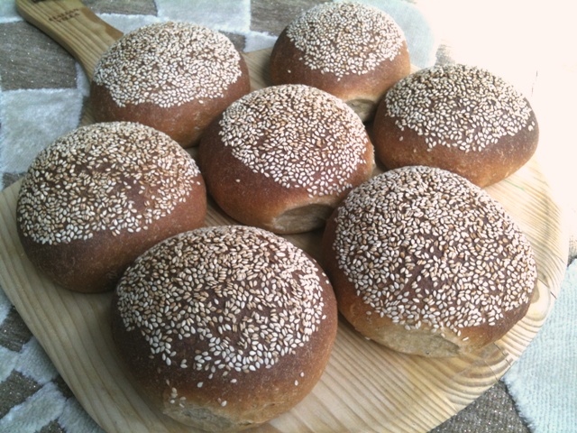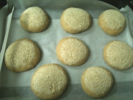 I’ve always wanted to try Laurel’s Whole wheat buns, and last weekend I had the chance to try one. I’ve chosen the feather Puff recipe, which is an enriched 100% whole wheat bread from the book: (Laurel's Kitchen bread book: a guide to whole grain breadmaking). The recipe calls for eggs, honey, butter, cottage cheese, and good deal of kneading (15 minutes kneading at least), and makes for wonderfully light buns (for whole wheat, that is!).I had no cottage cheese, and decided to do without it altogether.