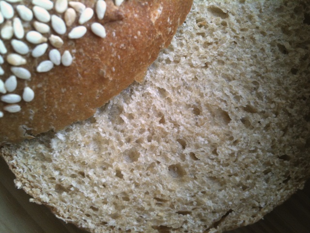 The crust is soft, and full of flavor, and the crumb is light, soft, yet dry. The eggs have contributed to the dryness of the crumb. The sesame seeds add a nutty flavor to the buns, and the bread has some pronounced sweet under tones, due to the Honey.