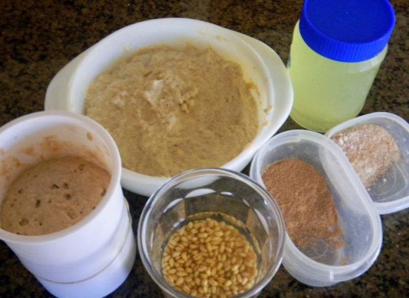 I also ground up the soft white wheat berries from the freezer and added the rest of the flours, home made malts, and salt to the ground flour in a bowl. The water and yogurt whey was added, mixed in well and allowed to autolyse on the counter for 2 hours before being refrigerated over night.