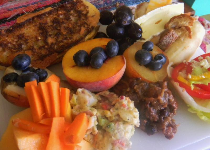 A nice brie and Colby jack grilled cheese sandwich using this bread with left over potato salad and BBQ baked beans, 1/2 ea of the 3 P's - pear, peach and plumb each stuffed with blue berries, 1/2 banana, black grapes, another 1/2 pear with brie and Colby jack , cantaloupe chunks with carrot pieces and a nice little salad with yellow and red papper topped with tomato and feta. A decent lunch for a decent sandwich bread.