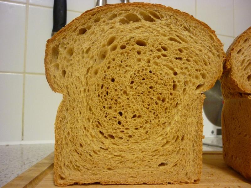 This loaf is somewhat akin to the improved loaf I made a few months ago but uses acidity from sourdough to boost volume. Milk and diastatic malt are used to soften the crumb.