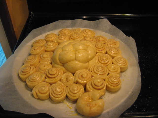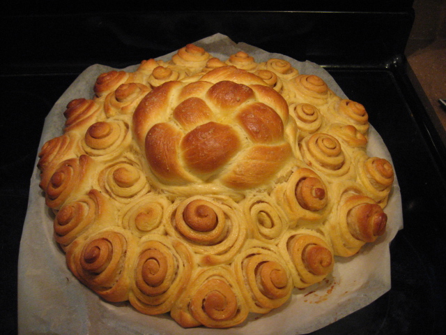 by Challah purists when I tote out my unconventional mutigrain with sprouts version that is unbraided yet round, so I see no reason why you shouldn't make an unconventional shaped sunflower that is round overall and very cool. I would still put the butter on and then put the cinnamon sugar mix on that and then stack 3 of them up to cut into wedges. I would also stick the sesame seeds on with a milk, honey and egg, glaze to make sure they stay put and to get that deep dark mahogany color.