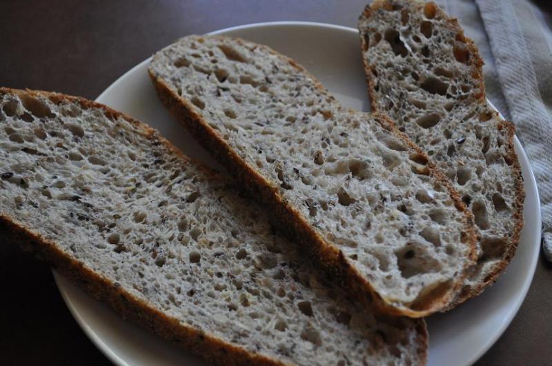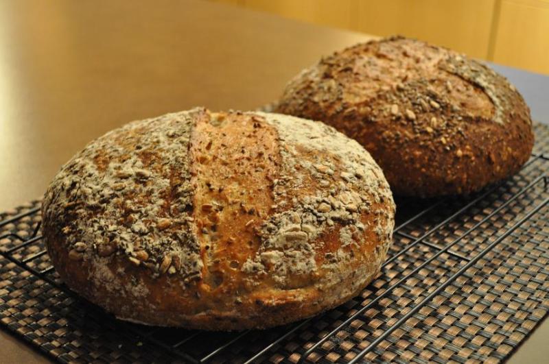 Here is my first try at JH 5 Grain Levain - with actual levain from my sourdough starter.  My previous versions of this bread were with only commerical active dry yeast.  I was happy with it, except wished for more rise/height in the boule.