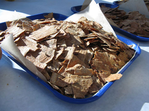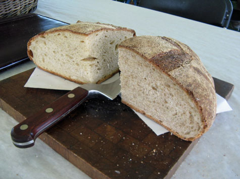 More sharing of good bread: a gorgeous wood-fired miche someone brought; check out the brick pattern imprinted on the bottom during the bake :^)