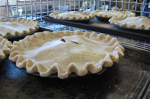 In Julie Richardson and Laura Ohm’s class, they were preparing some beautiful pies and tarts; these were peach and plum with raspberry – pleated pie and pastry perfection! (a picture of baked ones coming up, next post):