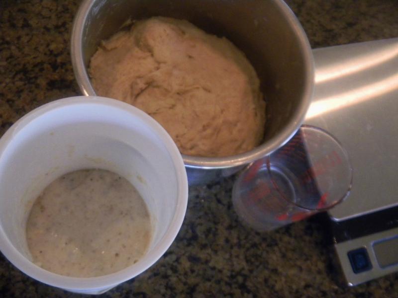 We love doing slap and folds and enjoyed kneading the dough this way for 3 minutes.  We held back 30 g of water and diluted the salt in it before adding it into the dough before the 2nd set of French slap and folds also lasting 3 minutes.  The extra water and salt were worked into the dough by squeezing the dough through the fingers until the dough came back together.  We rested the dough for 4 hours on the counter.