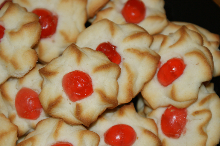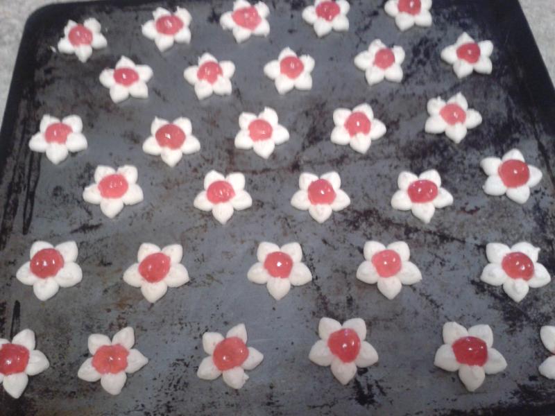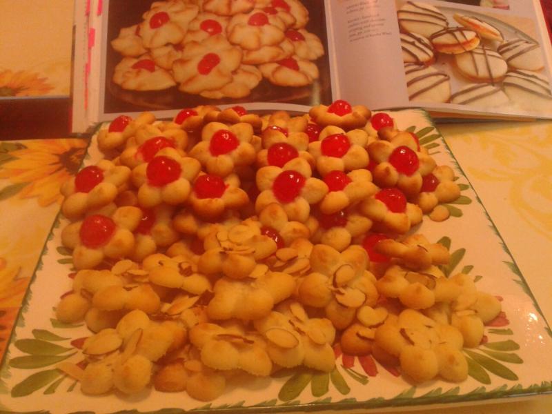 I attempted to copy the sample in the book photographed (and I suspect baked) by Sylvia Ginsberg... by using the cookie press and a five leaf pattern.. I actually got about 80 cookies out of a recipe that quotes 36... making them a very small but "delightful" treat.