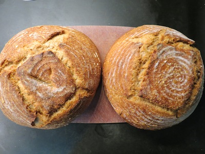 For my second miche taste test I wanted to do two things: compare King Arthur High-Extraction flour against Central Milling Type 85 Malted, and experiment with a smaller loaf after the comment from one of my tasters that the first loaf was "gummy" (though he ended up liking that loaf the best.) Above is a closeup of the result, with the Central Milling loaf on the left.