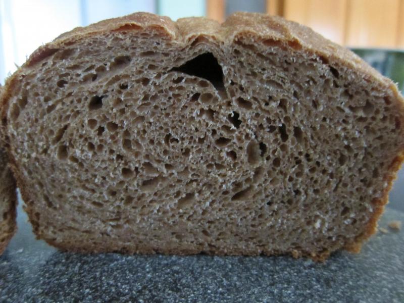 The crumb exhibits nicely developed gluten-nice thin walls on some of the small bubbles and a nicely browned crust.