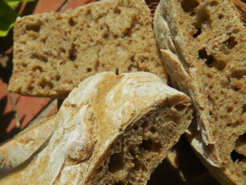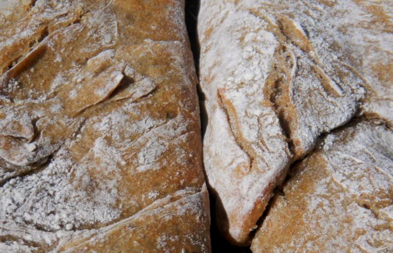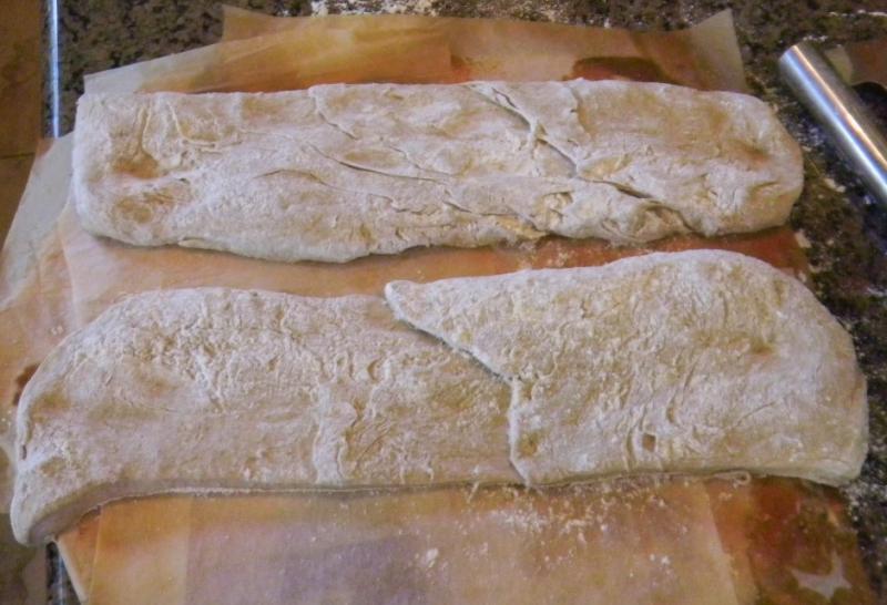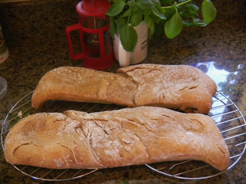 the coffee does the same thing as espresso powder does to chocolate or rye breads. I don't taste coffee but the flavors of the whole grains are enhanced and they taste more like the whole grain - like the taste of chocolate is enhanced with coffee. I like it and the bread tastes more robust with the flavors heightened but the coffee flavor muted. I really like this bread and it would be an exceptional panini or Cuban sandwich bread - being just the right thickness. If shaped on parchment on a peel after it comes out of the fridge and allowed to rise for a couple of hours, it would be a fine ciabatta. With sprouts and seeds (pumpkin and sunflower) it would make a nice boule too. Lots of ways to go with bread. It came out fine as a flat bread and I'm glad I went that way - with paninis for lunch today to show for it! They must have been 19" long at least since the overhung the stone on each end by at least an inch and a half on each end developing those hooks :-)