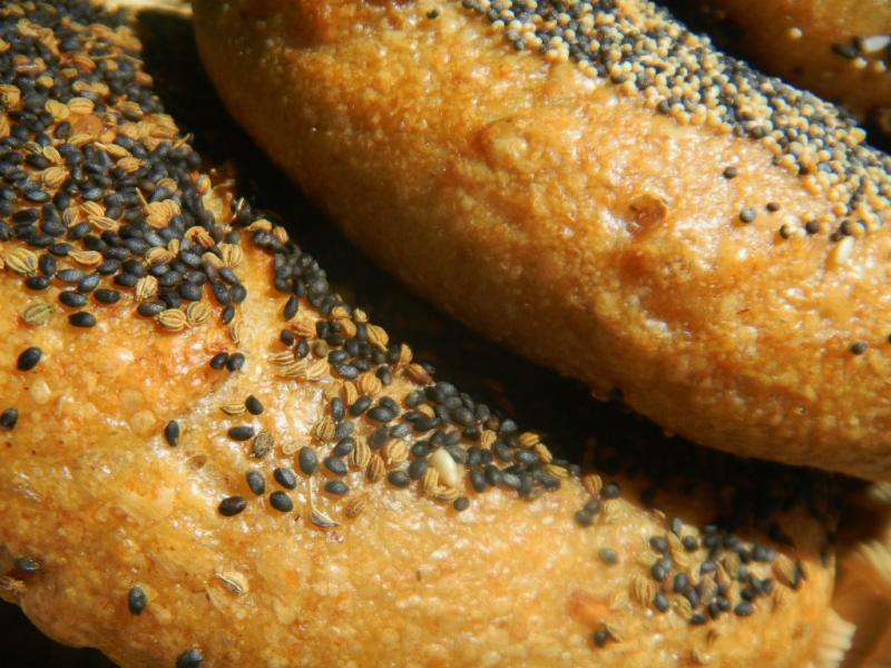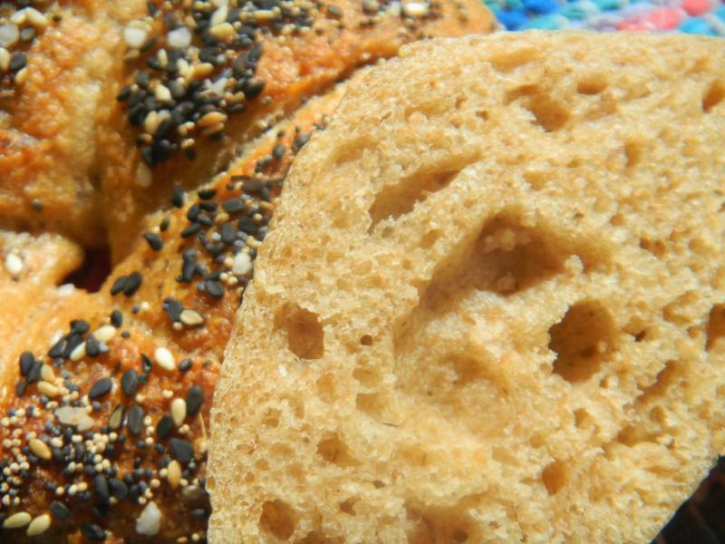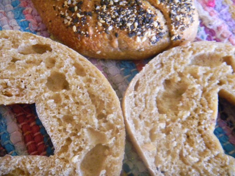 We also added some sprouts, 5%, to these bagels utilizing spelt, rye and whole wheat berries that were soaked for 3 hours and sprouted between damp paper towels under plastic wrap for 2 days. We did not use any white rye malt since we were out.